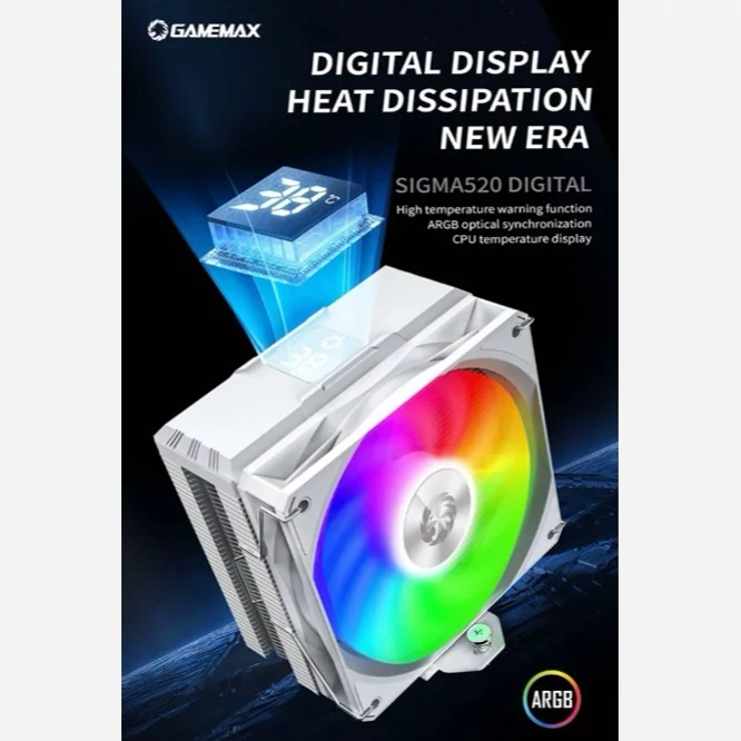 خنککننده پردازنده گیم مکس مدل GameMax Sigma 520 Digital یک کولر هوایی مدرن و کارآمد است که برای استفاده در سیستمهای گیمینگ و حرفهای طراحی شده است. این خنککننده از یک فن 120 میلیمتری قدرتمند بهره میبرد که توانایی بالایی در انتقال و دفع حرارت از پردازنده دارند.